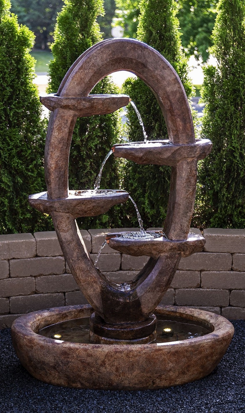 59.5″ tall fountain in 40.5″ x 25″ wide fountain basin shown in Relic Lava. Whimsical looking contemporary fountain. Cast stone fountain manufactured in the USA. This fountain includes lights.