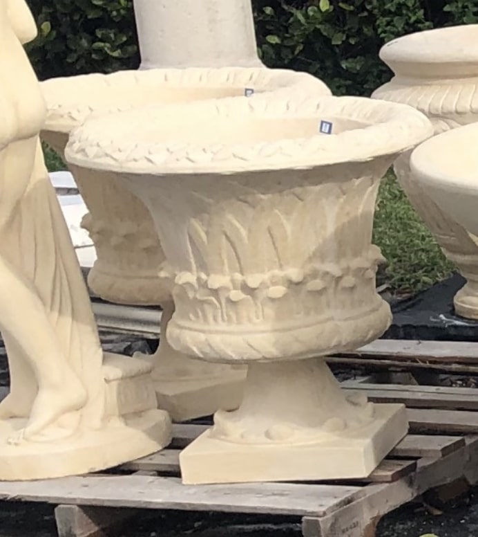 Intricately designed cast stone urn. Made in the USA. Concrete and built to last and sustain through Florida’s Hurricane season. Great finishing touch on a Mediterranean style home.